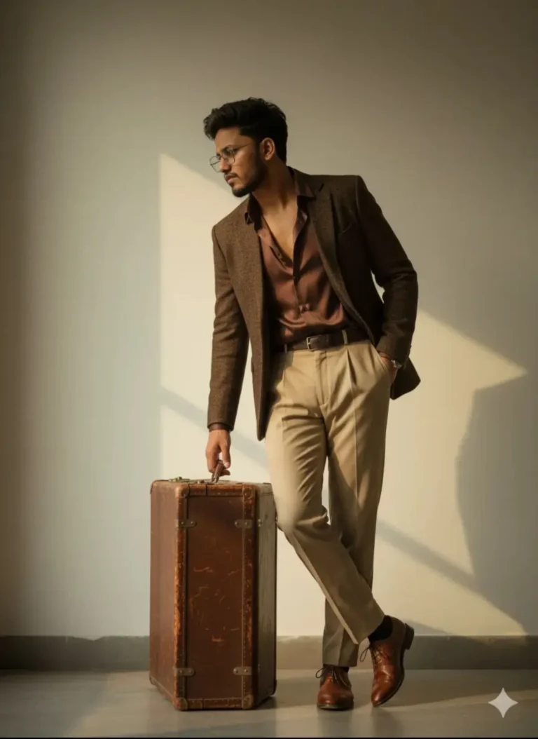 A stylish young man, facial will be the same as the reference image, with sharp features and dark tousled hair parted naturally. He is leaning casually against a vintage suitcase. He wears a textured brown blazer over an open-collar dark brown shirt, slightly unbuttoned at the top, paired with high-waisted light beige pleated trousers and a dark belt. The aesthetic is elegant and retro-inspired, with earthy tones.