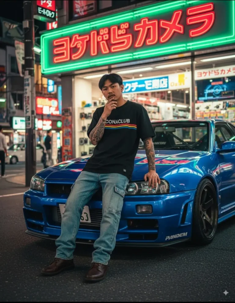 A full-body, urban street photography shot – Vibrant, high-contrast, candid composition of [reference man on the photo] leaning casually against a custom-modified blue Nissan Skyline GT-R R34 at night. [reference man on the photo] is standing with his legs slightly spread, resting his elbows on the car’s hood, his left hand near his chin/mouth, looking to camera with a contemplative expression.