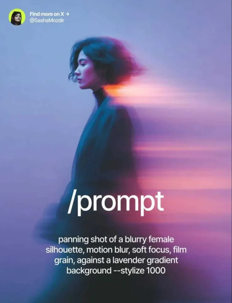 panning shot of a blurry female (make the face as per the image i uploaded) silhouette, motion blur, soft focus, film grain, against a lavender gradient background –stylize 1000
