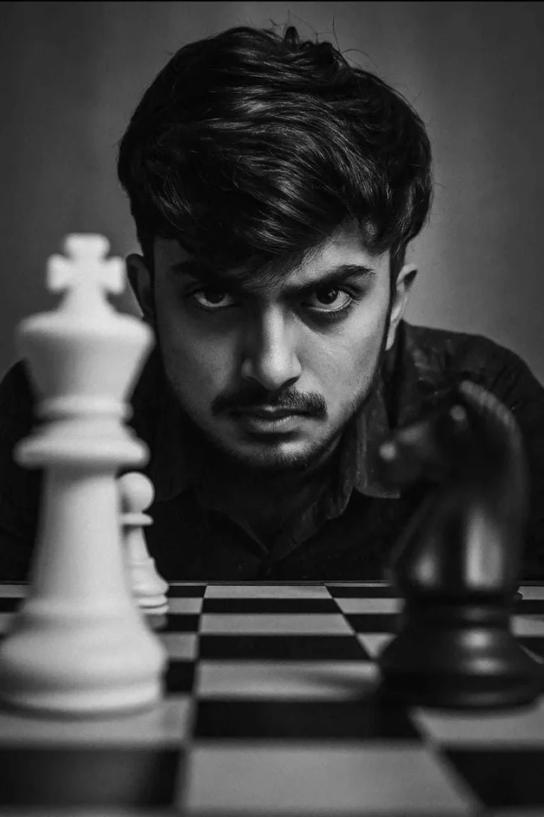 A dramatic young man (use the uploaded picture to reference the subject) black-and-white portrait of the reference photo intensely staring into the camera from behind a chessboard. The perspective is low and close to the board, creating a sense of depth and tension. A large white king chess piece stands prominently in the foreground, slightly out of focus, symbolizing power or challenge. On the right side of the board, a dark knight piece is also visible.