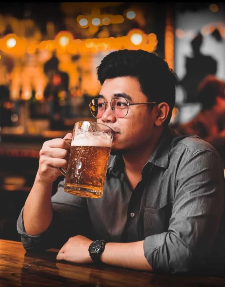 A high-quality, commercial-style image of me (use the uploaded picture to reference the subject) sitting at a bar or a warmly lit pub, confidently drinking from a large, frosty glass mug of golden beer, stolen shot, side angle. The scene has soft, ambient lighting with a slightly blurred background to give a cinematic depth of field. His expression is relaxed and content, like he’s enjoying the moment. He’s wearing a casual button-up shirt with a watch, and there’s a hint of modern bar atmosphere in the background – glowing lights, blurred figures, or bottles.