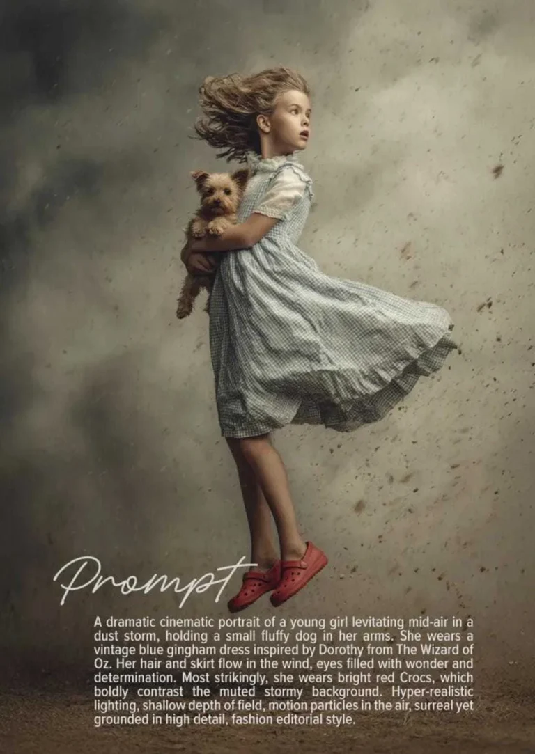 A dramatic cinematic portrait of a young girl levitating mid-air in a dust storm, holding a small fluffy dog in her arms. She wears a vintage blue gingham dress inspired by Dorothy from The Wizard of Oz. Her hair and skirt flow in the wind, eyes filled with wonder and determination. Most strikingly, she wears bright red Crocs, which boldly contrast the muted stormy background. Hyper-realistic lighting, shallow depth of field, motion particles in the air, surreal yet grounded in high detail, fashion editorial style