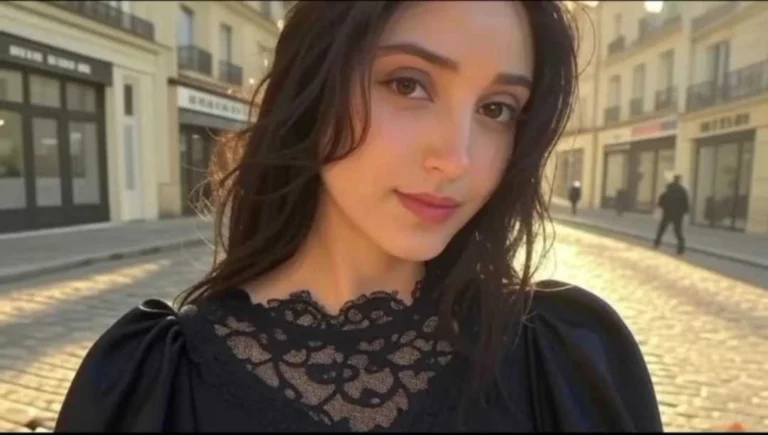 A high-end fashion editorial photo of a women standing in a sunlit parisian street, wearing a flowing black silk gown with intricate lace details. Her hair is windswept, eyes intense, posture elegent . Natural golden hour lighting bounces of cobblestone. Background shows a soft-focus Haussmann building with iron balconies. Shot on a Leica SL2, 85mm lense f/2.2, ISO 100 subtle color grading in muted earth tones, realistic fabric texture and movement. Make it bold and realistic, keep the face same as shown in the picture