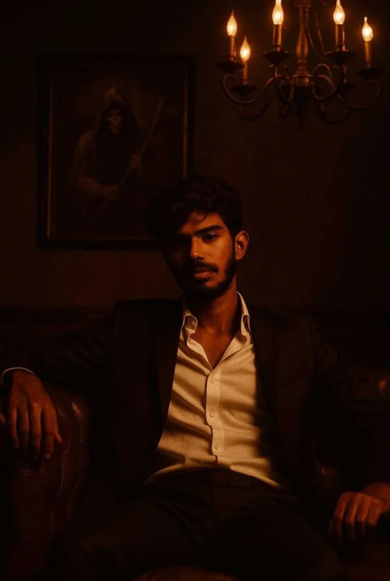 A cinematic, low-light portrait of a confident man sitting on a dark brown leather chesterfield sofa in a dimly lit, moody room. He wears a sleek black suit with an open-collar white shirt, exuding power and mystery. A gothic chandelier glows dimly above him, casting soft golden light and shadows. Behind him, a framed artwork of a grim reaper in a hooded cloak adds a dark, ominous tone. The color scheme is rich and dark, with deep browns, blacks, and soft amber highlights. The atmosphere is intense, elegant, and slightly intimidating – like a mafia boss or dark anti-hero in a noir film.