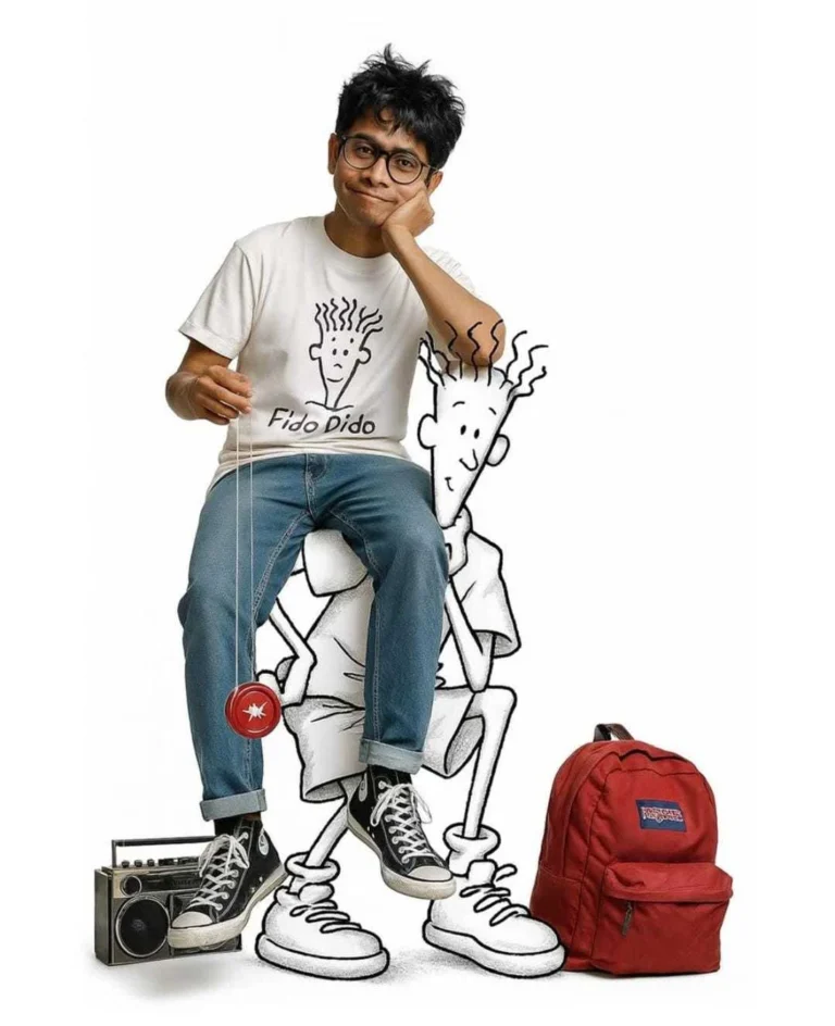 Create a cinematic, realistic image in portrait orientation. I appear as a realistic person, wearing a white t-shirt with a Fido Dido graphic, blue jeans, and Nike Kobe 4 Protro shoes. I am playing with a yo-yo string and should be depicted in detailed realism. Fido Dido, Pixar-style 3D illustrated as a black-and-white character, is carrying me on his back, holding my legs and looking at me, with me sitting on his shoulders. Beside Fido Dido’s feet are a vintage radio cassette player and a red Jansport backpack. The background should be completely white to highlight the contrast between the realistic and Pixar style 3D Fido Dido character. The image should clearly show full-body views of both me and the Fido Dido character.