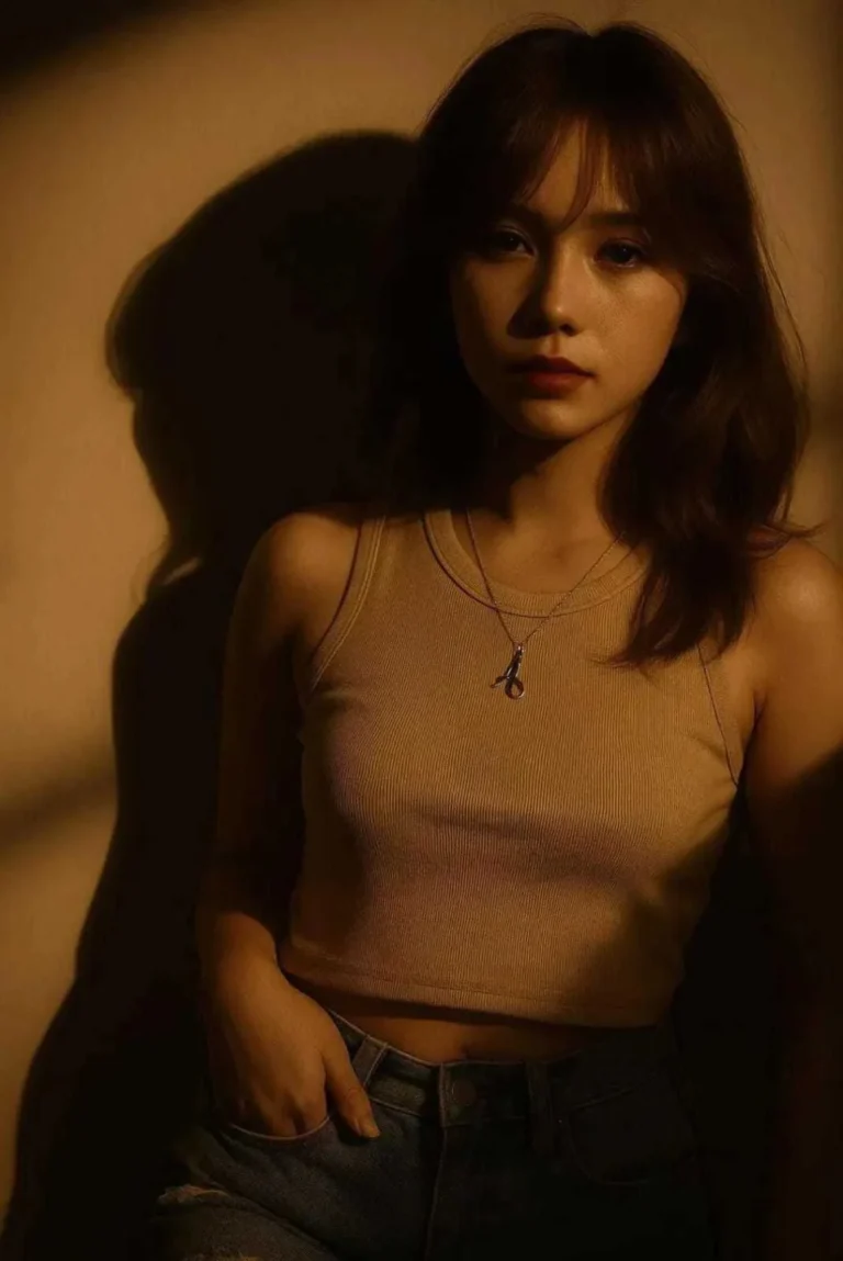 Keep the same lighting, background, and camera angle as the reference: warm golden-hour sunlight casting dramatic shadows on a plain wall. Replace my hairstyle with medium-length, slightly wavy hair. Smoothen the skin to make it fair and flawless, and maintain a calm, introspective expression. Ensure the strong shadow of the face on the wall is visible.
