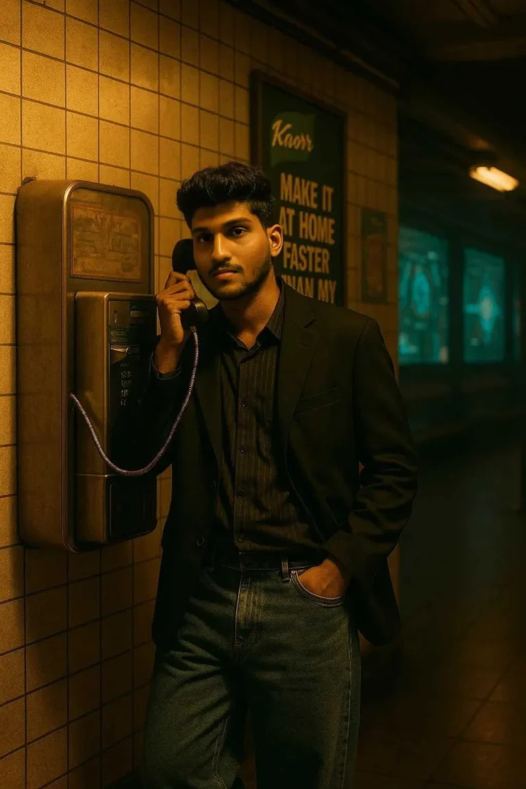 Generate a cinematic image of me standing at a payphone in a retro subway station, leaning casually against the booth while holding the receiver to my ear. Outfit: black blazer over a shirt with subtle stripes, and oversized baggy jeans. Lighting: warm, orange-yellow moody tones, soft glow with a slightly vintage or film-like filter. Background: tiled subway wall with an old advertisement and a Knorr poster saying ‘MAKE IT AT HOME FASTER THAN MY MOM’. The vibe should be 90s nostalgic with a modern editorial twist. Maintain realistic proportions and replicate my facial features accurately from the selfie