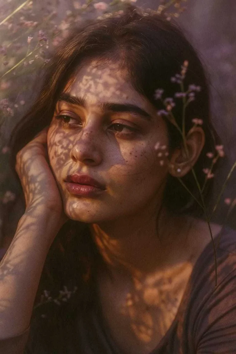 CompositionalPortrait, dreamy floral gaze, golden hour, cinematic close-up of a young woman (same as in image i uploaded), filtered sunlight through wildflowers casting intricate shadows on skin, soft film grain, muted violet palette, 85 mm lens, f/1.4, sharp skin texture, subtle freckles, glossy lips, delicate bokeh, zero