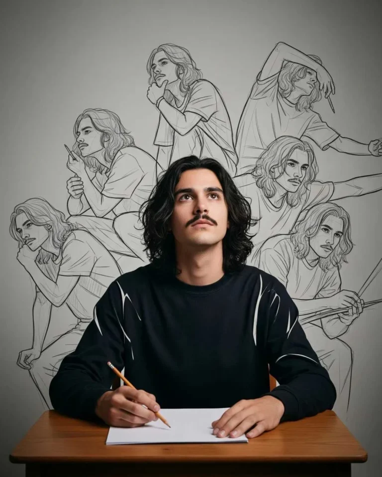 Create a conceptual art image showing a young man with shoulder-length wavy black hair, thin mustache, no beard, wearing an oversized black shirt. He sits at a wooden desk with a thoughtful expression, holding a pencil and staring upward. Surrounding him are multiple semi-transparent sketch-like versions of himself in dynamic poses (holding chin, reaching, sketching, leaning), blending rough pencil lines with partially rendered realistic shading. The background is a minimalist studio-like wall. The style combines hyperrealism for the main figure with artistic hand-drawn sketch lines for the surrounding versions.
