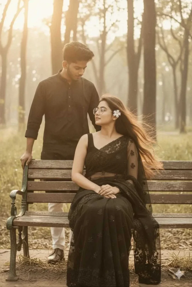 The girl should be draped in a perfect black net saree and with sleeves less blouse, pintrest -style aesthetic saree. The vibe must capture the essence of a 90s movie brow haired baddie, long her hair and with a white flower in the hair enhanced by a windy, romantic atmosphere and the guy should be wearing an black kurta with white chinos she sits on a wooden bench.