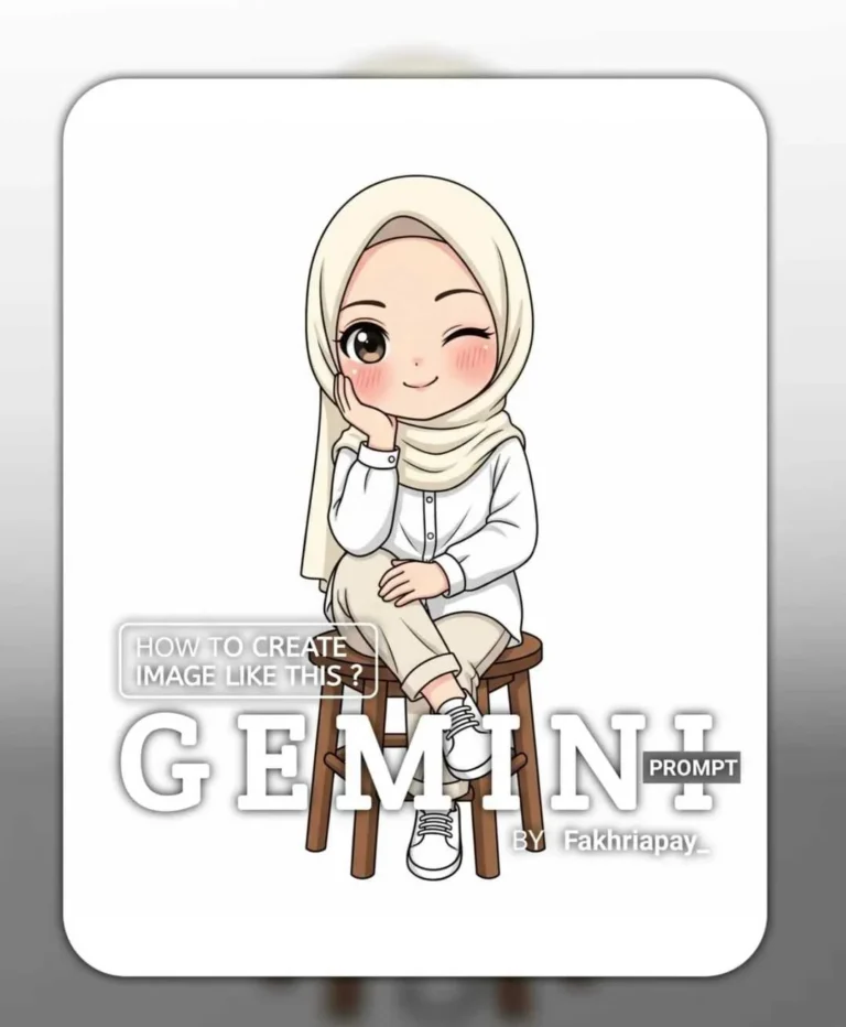 Create a sticker of cute chibi-style girl sitting on a stool, wearing a cream pashmina hijab, a white button-up shirt, cream-colored chino pants, and white casual shoes. She is winking with a relaxed pose, one hand resting on her cheek and the other on her lap. White background, no text, clean and simple composition, anime chibi style, soft shading