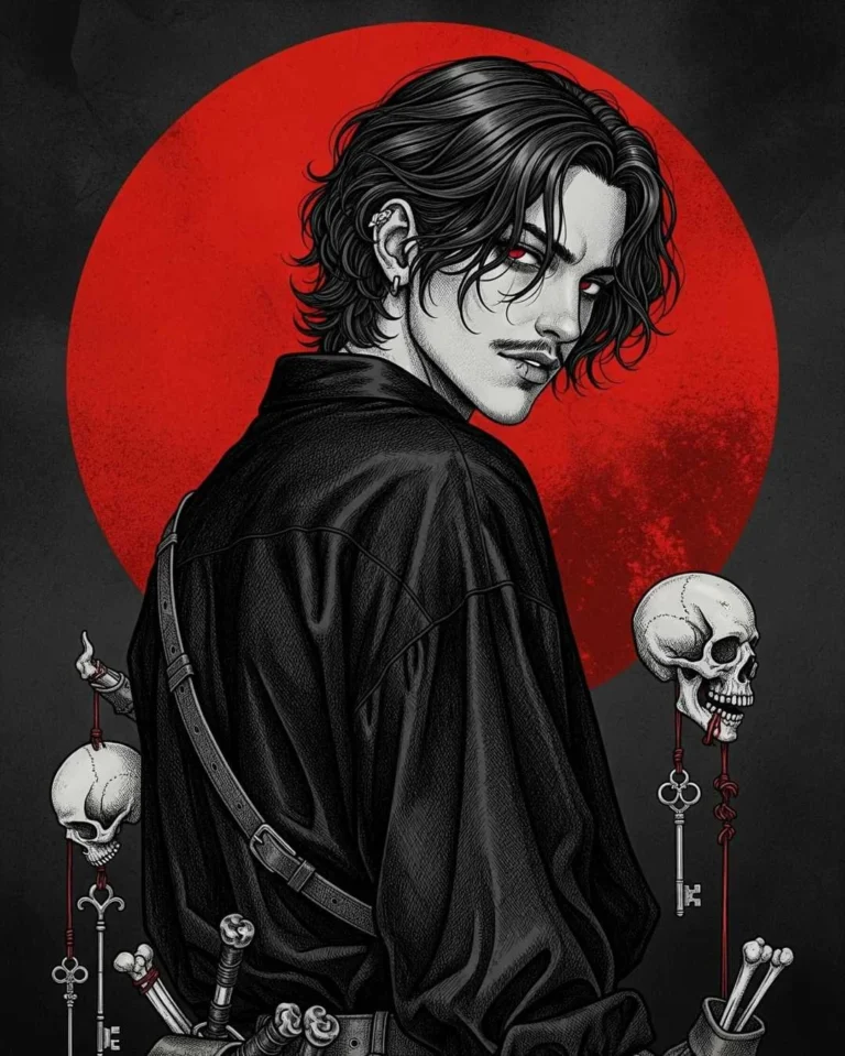 A hyper-detailed, dark fantasy portrait of a young man in a 3:4 ratio, illustrated with intricate linework and gothic surrealism. The character has shoulder-length wavy black hair, a thin mustache, and no beard. He wears an oversized black shirt with textured fabric details. His expression is mysterious and intense, with a slight smirk. The background features a large red sun with faint texture patterns, reminiscent of Japanese ink art. His pose is turned slightly to the side, looking over his shoulder. Around him are gothic elements such as skulls, keys, bones, and mystical objects hanging from belts and pouches. Lighting is dramatic and moody, highlighting the folds and textures of his clothing. Ultra-detailed, cross-hatched style, concept art aesthetic, inspired by vintage etching and dark graphic novels.