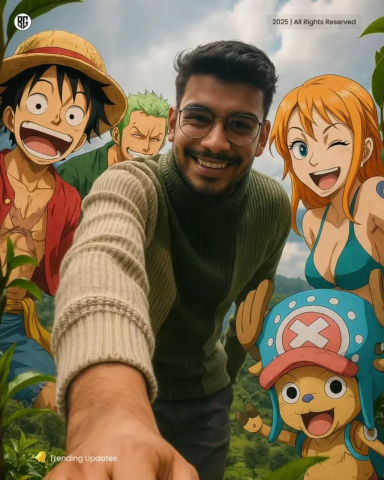 Create image A fisheye lens selfie photograph of a young man (use face from the uploaded image) wearing a woolen two-tone sweater (beige and green), smiling naturally, outdoors surrounded by Monkey D. Luffy, Roronoa Zoro, Nami, and Tony Tony Chopper from One Piece. Everyone is making happy, playful faces. The scene is set in a lush green hilly landscape with tea plants, trees, and cloudy skies. Ultra wide-angle perspective with hand reaching toward the camera. Stylized realism blending anime characters seamlessly into a photorealistic setting. Cinematic lighting, sharp focus, DSLR depth of field, warm natural tones, high detail.