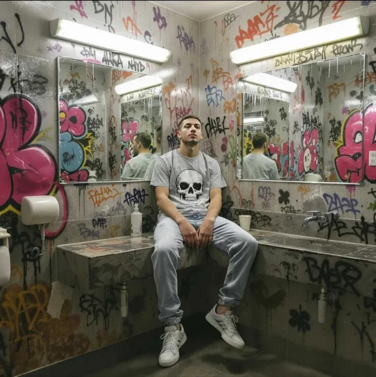 A young man in a grey t-shirt with a skull graphic, light wash jeans, and sneakers, sits on the counter of a public restroom. The walls and counters of the restroom are heavily covered in vibrant, multi-colored graffiti. Two mirrors reflect more of the graffiti-covered space behind him, and fluorescent lights illuminate the scene from above.