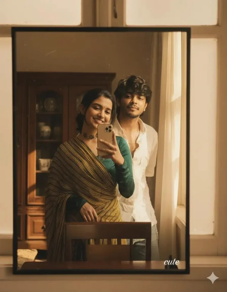 Create a 4K Ultra-HD self- friends portrait of uploaded images, taken through the reflection of an square mirror with a thin black border, one holds a gold iphone in left hand, while on the right standing friend. Afternoon sunlight streams in through the window on the right, creating dramatic shadows that highlight the face. The image has a vintage and nostalgic aesthetic