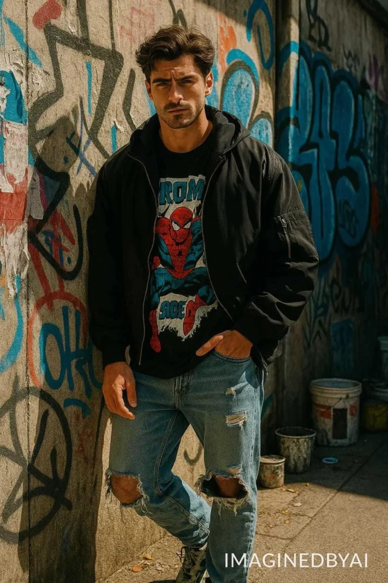 Transform this man into a high-fashion streetwear model styled for an edgy urban editorial. Outfit includes an oversized bomber jacket layered over a bold, graphic-print t-shirt. Add distressed ripped jeans and chunky designer sneakers – Nike, Yeezy, or similar streetwear staple. Accessories can include rings, chain, or a small crossbody bag. Hair should be slightly messy or styled with texture to match the raw vibe.