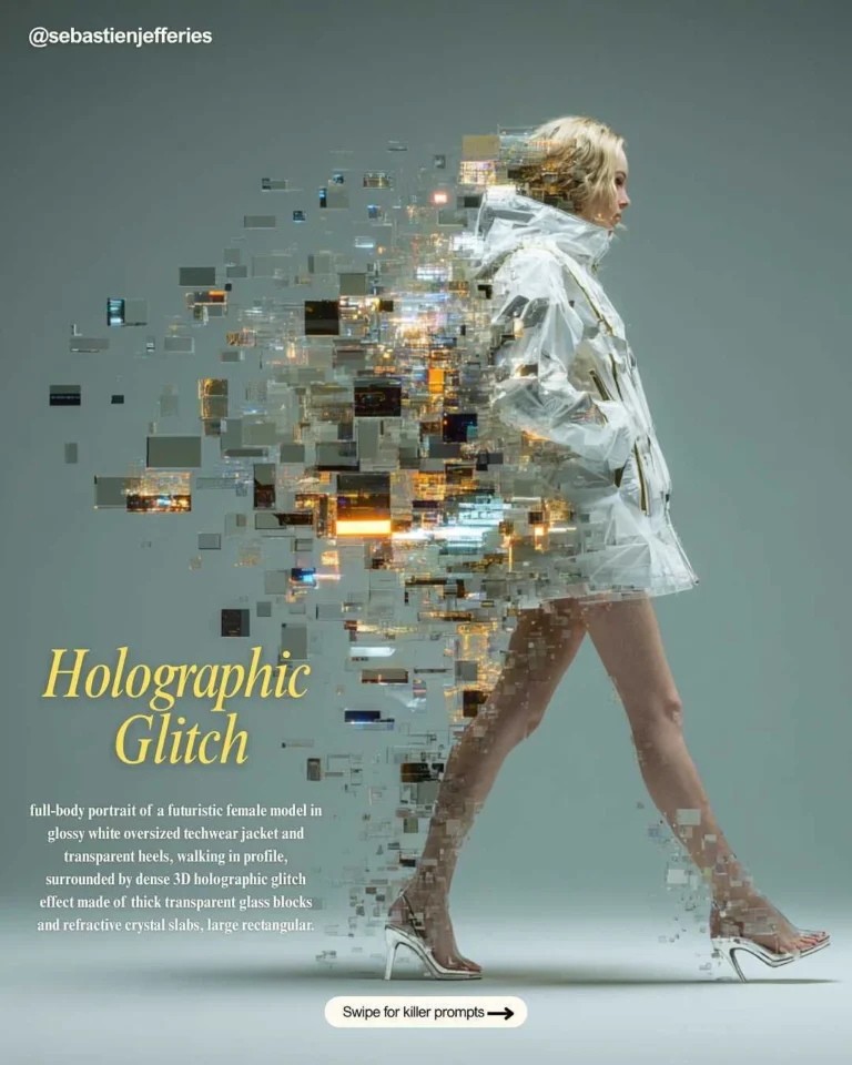 full-body portrait of a futuristic female model in glossy white oversized techwear jacket and transparent heels, walking in profile, surrounded by dense 3D holographic glitch effect made of thick transparent glass blocks and refractive crystal slabs, large rectangular.