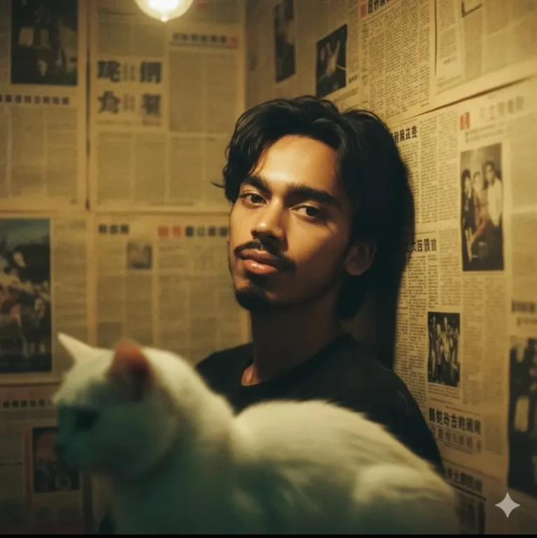 Narrow Hong Kong room, walls plastered with old yellowed Cantonese newspapers. Fluffy white cat blurred in foreground.