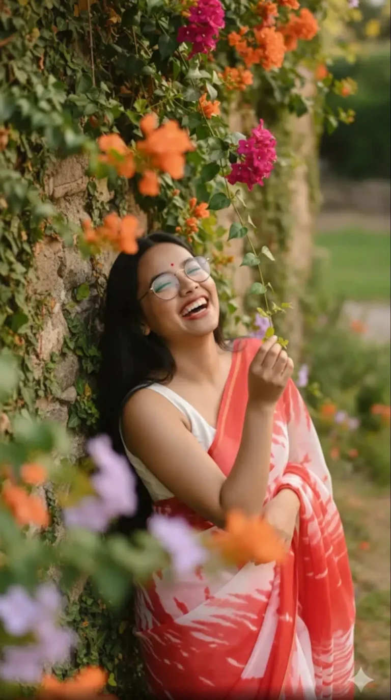 Hyper-realistic overhead 9:16 close-up of myself with glasses, playfully leaning against an ivy-covered stone wall of an old countryside cottage during golden hour. I’m laughing with my head slightly tilted back, one hand brushing away a dangling vine, wearing a textured earth-tone knit sweater layered over a soft white t-shirt. The flowering vines are in full bloom with orange, magenta, and lavender hues, softly blurred in the foreground. Warm, cinematic lighting with a pastel sky glow ultra-detailed textures, and natural skin tones in sharp focus, captured in 8K.