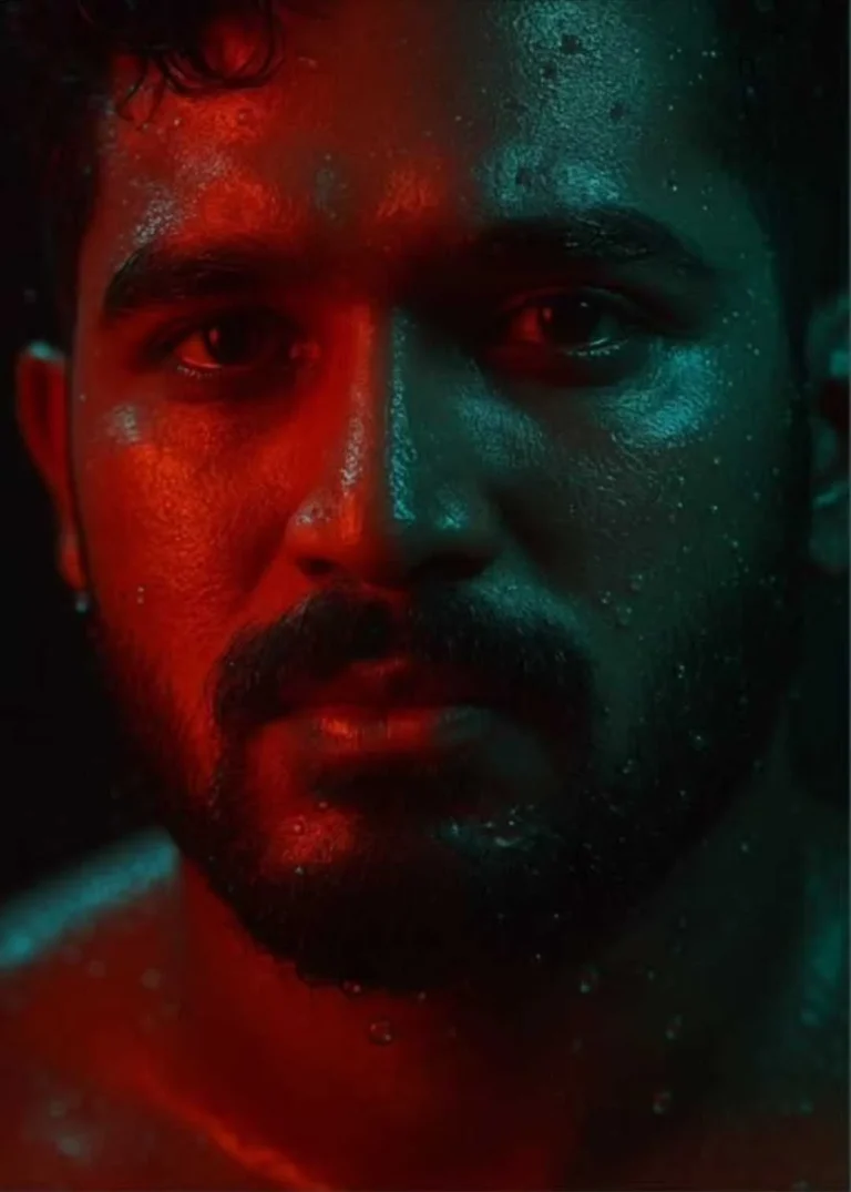 A hyper-realistic close-up portrait of my face, with only the left half visible. The scene is illuminated dramatically with soft, ambient red and teal neon lighting, casting colorful reflections on his wet skin and damp hair. Water droplets and small bubbles cling to his face, enhancing the cinematic mood. The skin texture, slight beard stubble, and intense eye focus are clearly visible. Make him wear a suit.