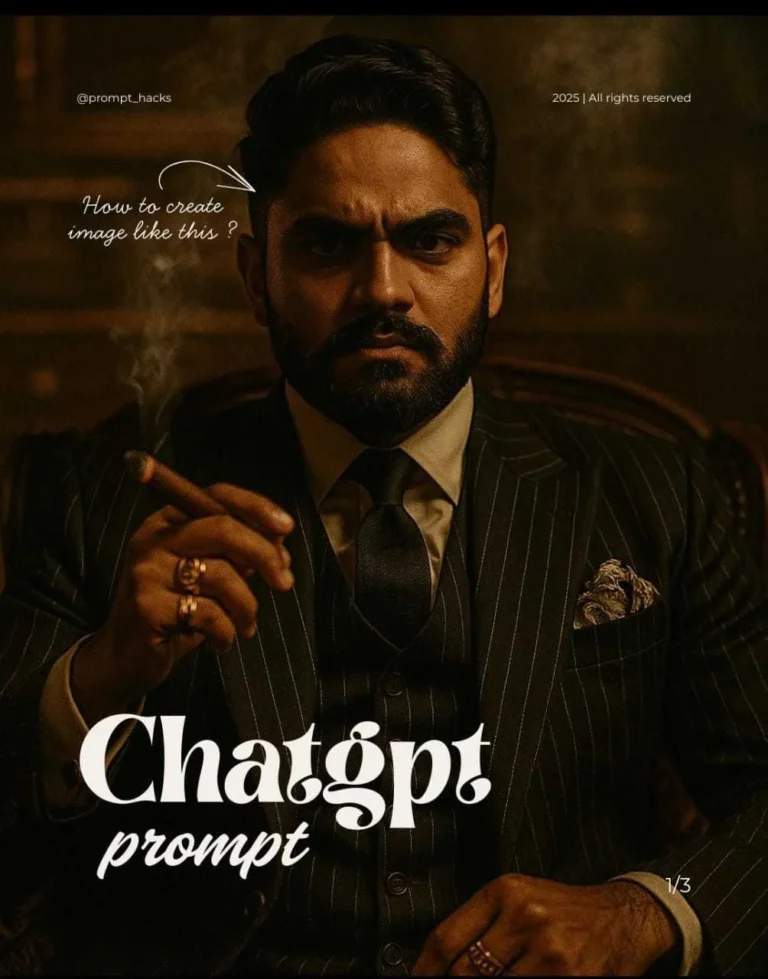 Perfectly Using uploaded image to create “A powerful 1940s mafia boss beard sits confidently in a luxurious, smoke-filled room. He wears an immaculate pinstripe three-piece suit, a silk pocket square, and several gold rings. He holds a cigar in one hand and stares intensely into the camera with a stern, commanding expression.