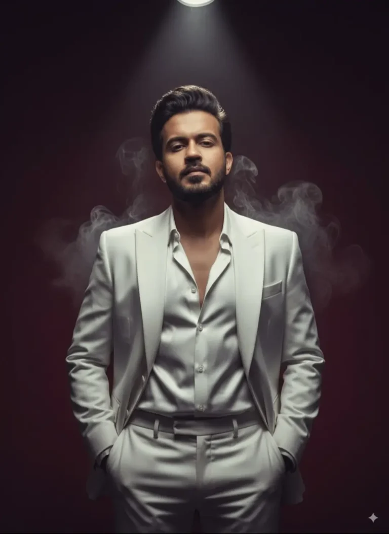 spotlight.Outfit: Fit white luxury suit with fit-leg trousers, paired with a slightly unbuttoned white silk shirt. Both hands tucked casually in pockets, shoulders relaxed, confident expression, head tilted slightly upward.