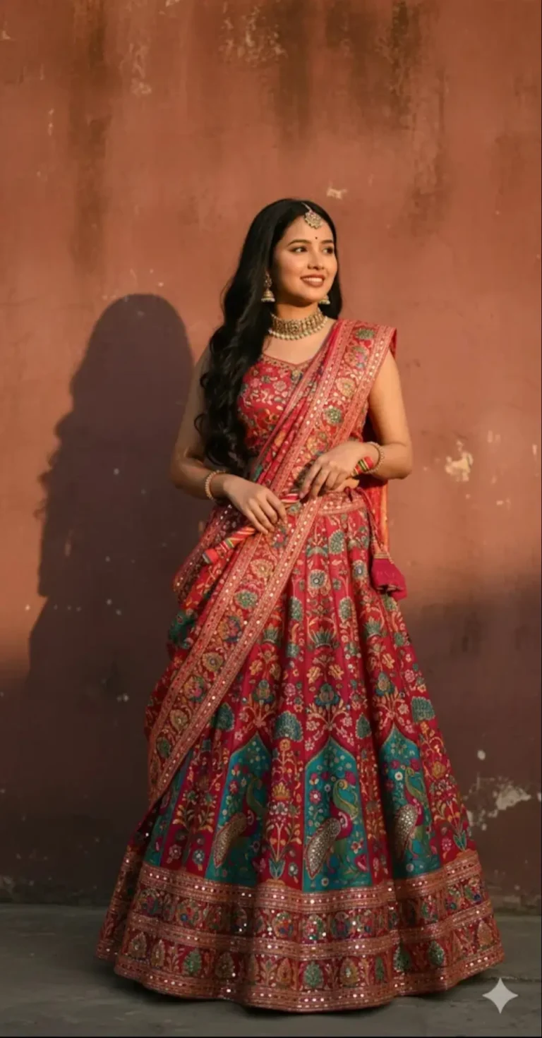 A beautiful woman [exact face from the image] in Navratri traditional Indian attire, possibly a(desi chamkila vibrant jaipuri kalamkari lehenga) lehenga choli, with intricate embroidery She has long, wavy black hair and is looking slightly to her right. The image has warm lighting, suggesting either sunrise or sunset, creating a dramatic shadow on the burgandy colour wall behind her. She is holding what appears to be a dandiya stick. Use my actual face and don’t alter my face from the picture.