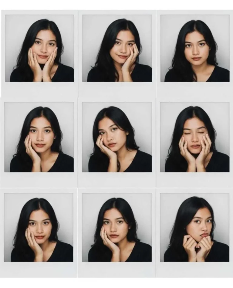 A nine-cut photo booth strip taken with a sticker photo machine, featuring me (use face of uploaded me) showing different expressions and clothes in each frame. The images evoke a sense of nostalgia and bittersweet memories. The lighting is simple and minimal, similar to that of an instant photo booth. The final result resembles Polaroid-style photographs, adding a vintage and sentimental atmosphere