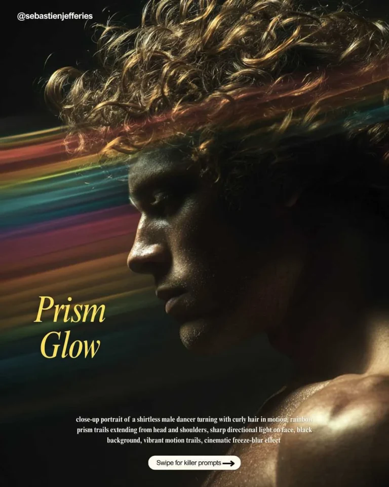 prism trails extending from head and shoulders, sharp directional light on face, black