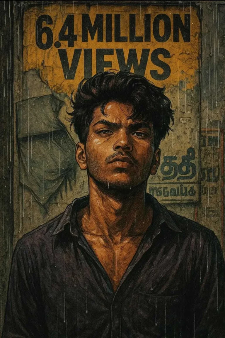 A hyperrealistic, manga-inspired digital portrait of a young man (make the face as per the image i uploaded) with a rebellious look, standing in front of a gritty, rain-soaked street wall covered in peeling posters and Tamil text. Behind him, a large distressed yellow poster reads “6.4 MILLION VIEWS” in bold capital letters.