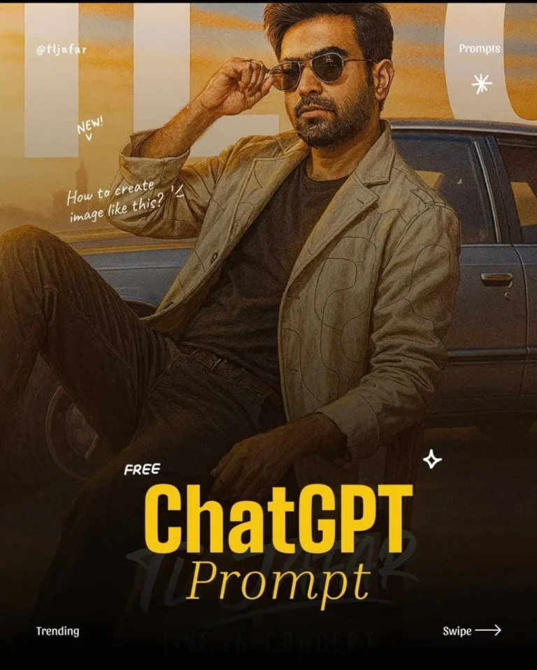 Create a hyperrealistic digital poster of a stylish man (based on the uploaded reference photo) confidently lounging against a vintage luxury car during golden hour. He is wearing a designer jacket with abstract line patterns over a textured sweater, paired with dark pants and casual boots. His hair is voluminous and slightly styled, and he wears modern sunglasses, giving off a calm and charismatic vibe.