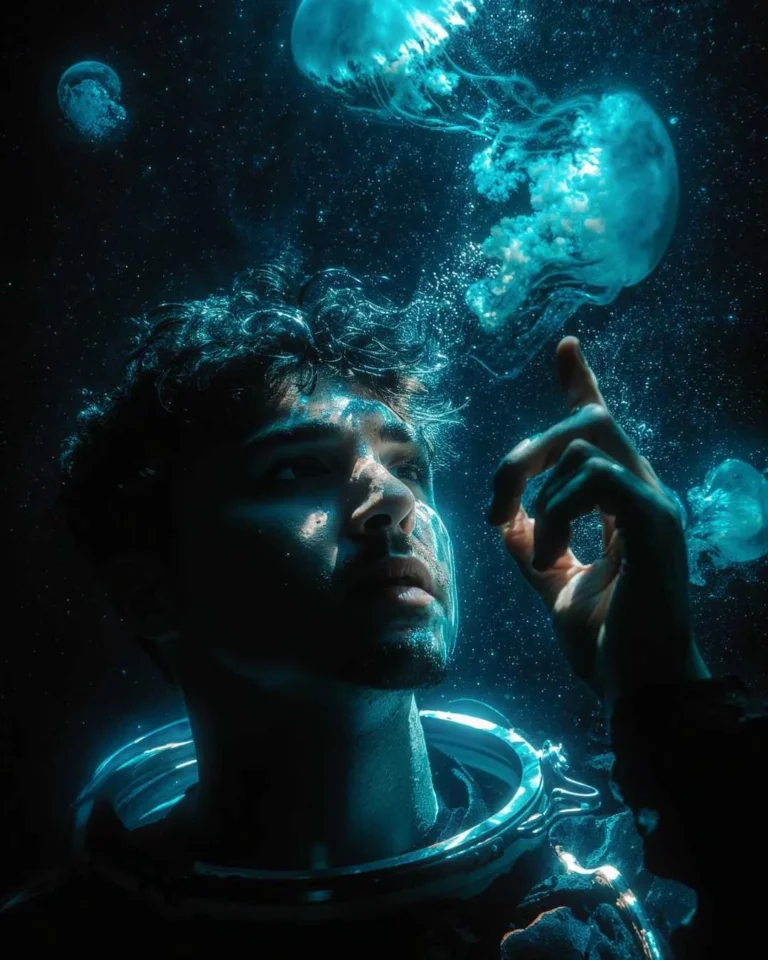 upclose underwater photo of a young man underwater in an astronaut suit white no helmet, his face is looking up at a jellyfish that is floating right above him, photo taken from his side profile, his pointer finger is reaching for the jellyfish, there is a jellyfish right in front of his face, no astraunaut helmet, his hair is dynamicly moving in the water, dark lighting, there are a lot of small glowing jellyfish that are emitting light in the water around him, water bubbles, he has no helmet on, shot on a 135mm lens