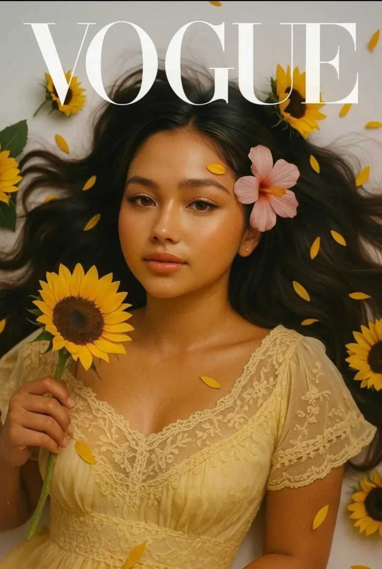She wears a [describe outfit, e.g. flowing yellow dress] and is surrounded by dozens of sunflowers, with one held in her hand and petals in her hair. Her makeup is [describe makeup]. Her expression is soft and editorial as she gazes up at the camera.