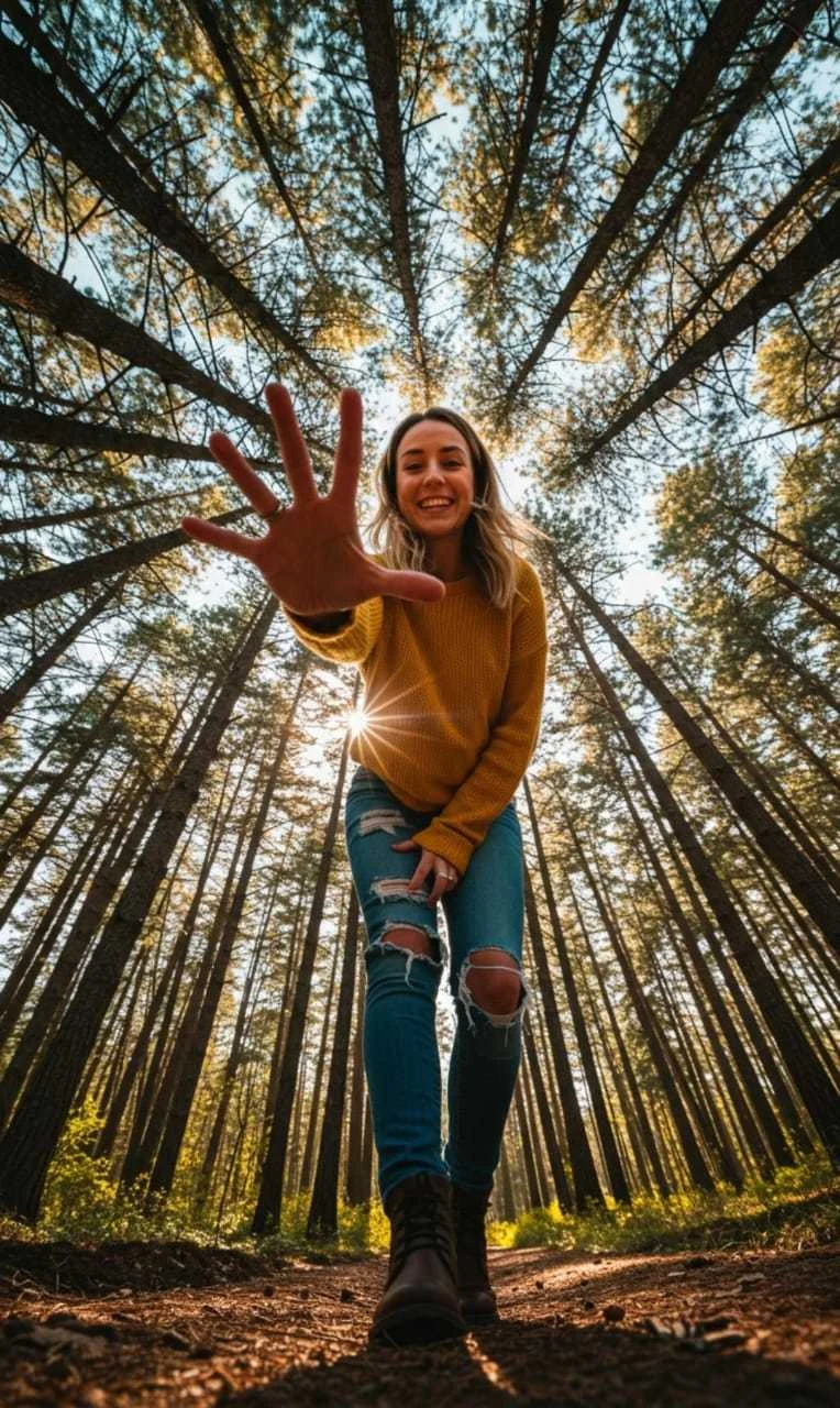 worm’s-eye view photograph, a smiling woman in a yellow sweater and ripped jeans (use face of uploaded me), extreme low angle, forced perspective making her hand look enormous, towering pine trees creating radial lines, sun flare, backlit, joyful mood, ultra-wide angle lens effect, cinematic photography, high detail. –ar 9:16