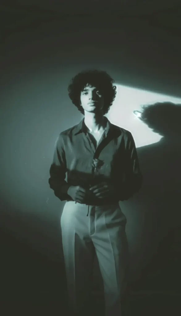 A stylish young man with dark, curly hair, looking directly at the viewer with a thoughtful expression. He is wearing an open-collar, long-sleeved shirt and light-colored trousers. He holds a single rose in his hands. The lighting is dramatic and moody, with a strong, directional light source casting a distinct shadow on the wall behind […]