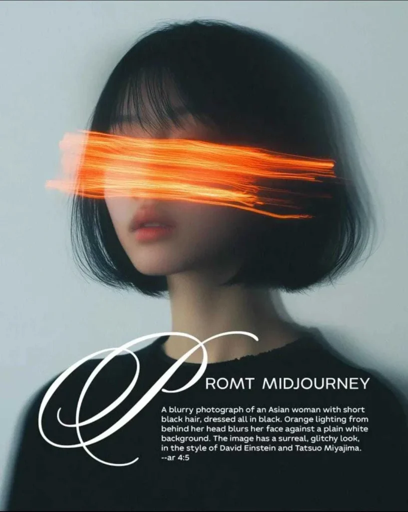 A blurry photograph of an Asian woman (make the face as per the image i uploaded), dressed all in black. Orange lighting from behind her head blurs her face against a plain white background. The image has a surreal, glitchy look, in the style of David Einstein and Tatsuo Miyajima. –ar 4:5