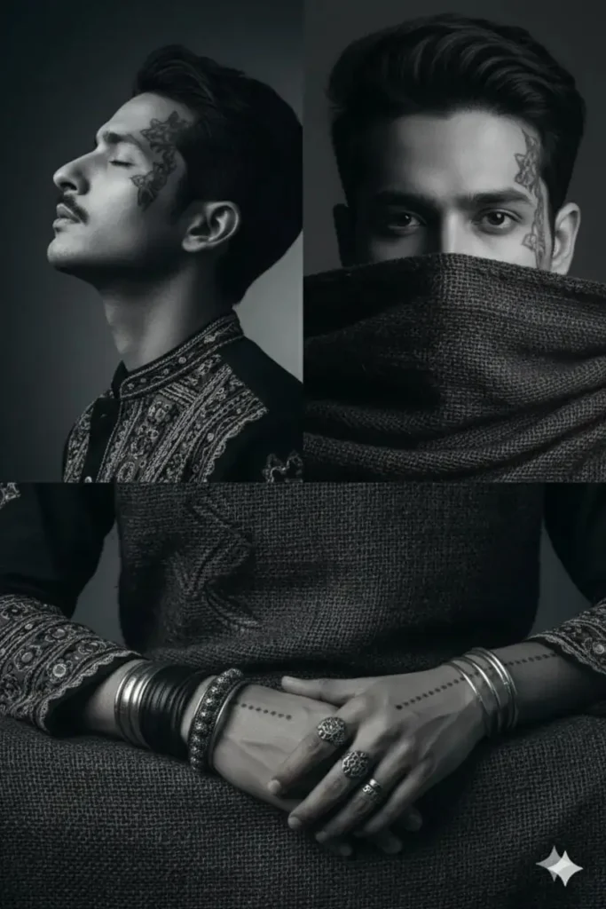 A triptych of a 26-year-old Indian man in black and white. First panel: his head tilted back slightly, eyes closed, stubble highlighted under strong side lighting. Second panel: intense close-up of his eyes staring directly at the camera, partially covered by a patterned shawl. Third panel: his hands resting on his lap, wearing leather bracelets […]