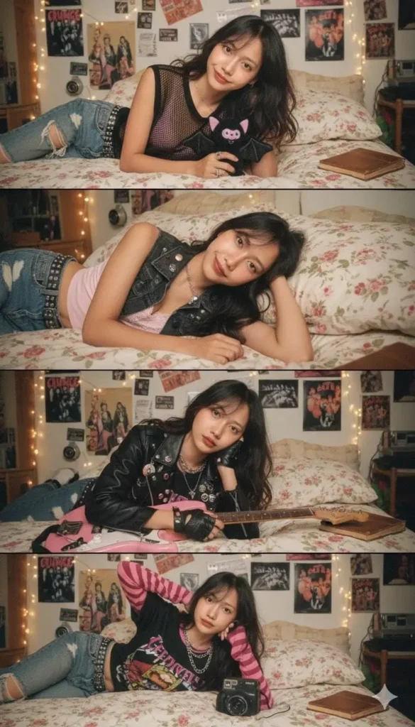 A natural-detailed, natural-realistic photo strip with 4 collage frames arranged vertically in cinematic landscape format, capturing a woman (keep face features consistent and unchanged) wearing elegant mini dress coral goth-simple rockstar-inspired outfits. She’s laying comfortably on her bed with four expressive poses: cute, sweet smile, effortlessly sexy, and a bit silly. Both she and the […]