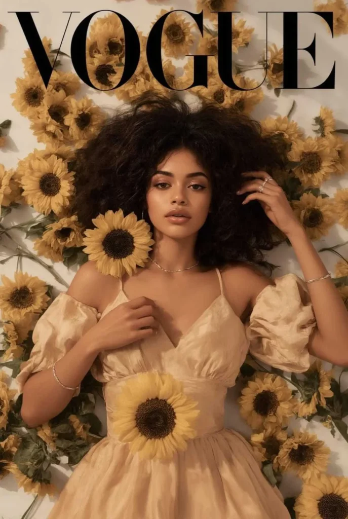 Create a cinematic VOGUE cover animation of a [describe model] with [skin tone] and [hair style], lying on the floor of a white studio. She wears a [describe outfit, e.g. flowing yellow dress] and is surrounded by dozens of sunflowers, with one held in her hand and petals in her hair. Her makeup is [describe […]