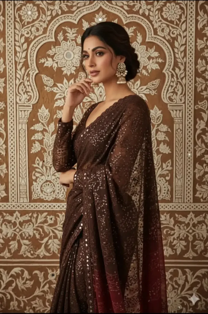 Ultra-realistic editorial portrait of a graceful South Asian woman with a poised, regal expression. She wears a deep brown sequinned saree with intricate mirror and thread embroidery across the fabric, subtly transitioning into maroon near the hem. The saree has sheer sleeves and densely embellished borders, worn in a classic drape with soft pleats and […]