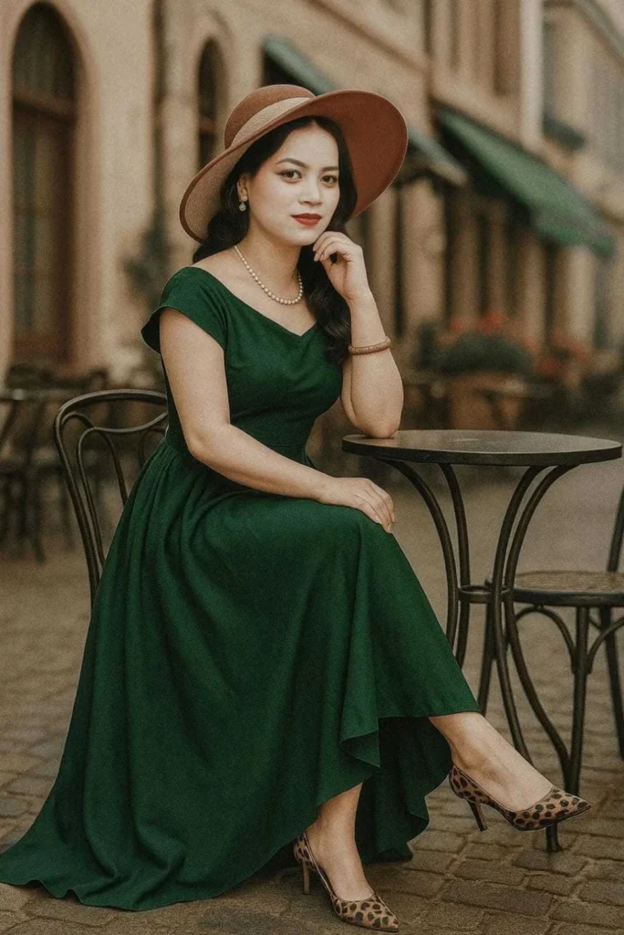 A vintage-inspired portrait of a graceful woman sitting elegantly at an outdoor café. She wears a deep emerald green dress with a flowing skirt and cap sleeves, paired with chic leopard-print heels. A wide-brimmed two-tone hat in warm brown and beige shades adds a touch of classic glamour, complemented by pearl earrings, a delicate necklace, […]