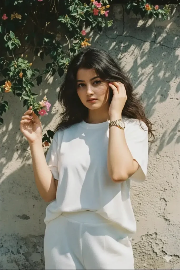 Create a grainy retro vintage of a young woman standing front of wall with wearing loose white wool T-shirt and pant, luxury formal watch, hair like 90’s movie baddie.plucking flowers from a flowering vine by one hand another hand at head looked in cemera. face 100% match from uploaded image, windy environment hd sharpen resolution […]