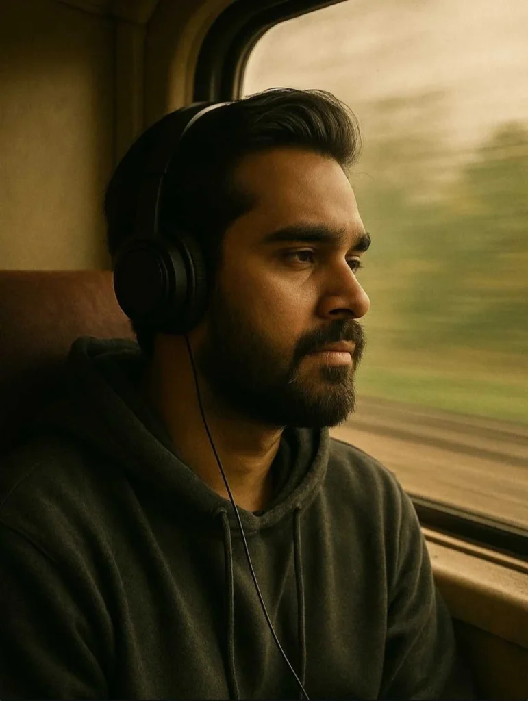 Side view of me looking out the window of a moving train. The interior is dim and warm-toned, while the outside world rushes by in soft motion blur. I sit still with a thoughtful expression, wearing headphones and a simple hoodie. The aesthetic is nostalgic, reminiscent of 35mm film with soft grain and moody natural […]