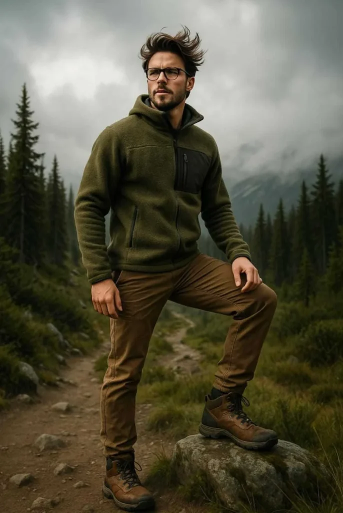 Reimagine the man as a rugged outdoor fashion model. Outfit: fleece or windbreaker, hiking boots, earthy-toned pants. Pose: standing on a rock or path, one foot up, wind in hair. Expression: free, fierce. Lighting: natural with clouded sunlight. Background: mountain trail, forest, or foggy wilderness. Look should blend fashion with wild energy.