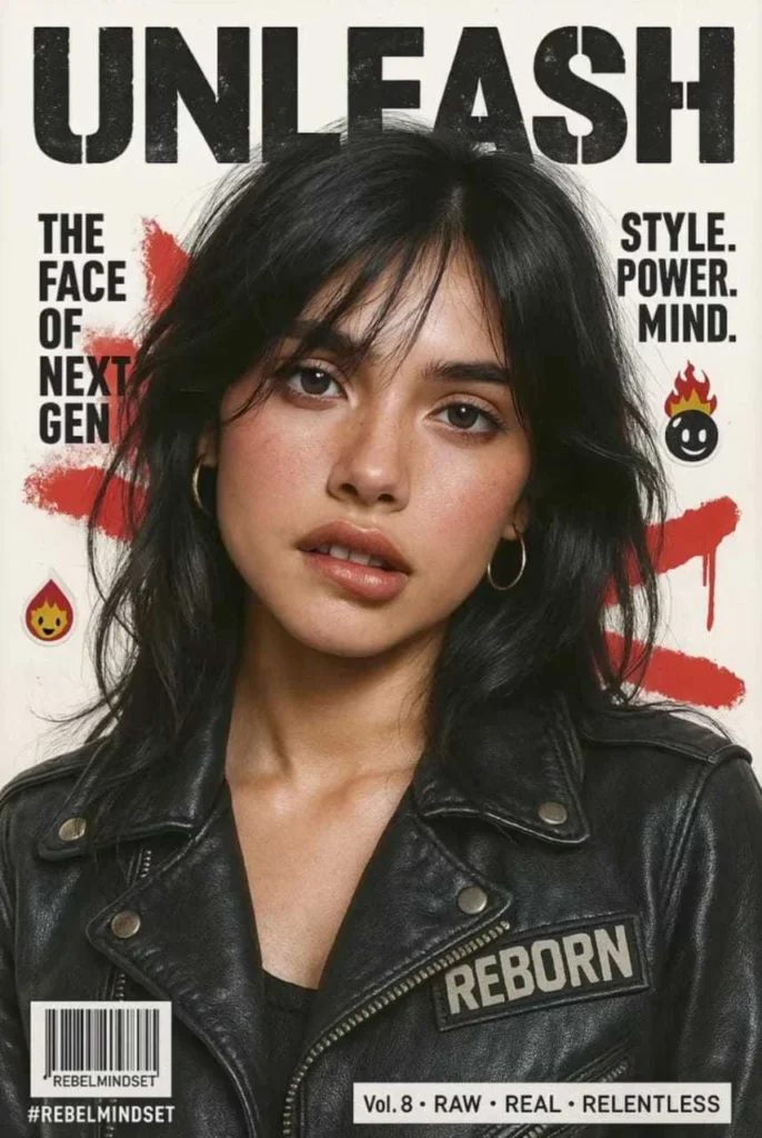 Create a modern magazine cover-style design, ultra-detailed and vibrant, featuring a striking frontal portrait of the same young girl (use face uploaded in image). she is biting her lip slightly, wearing a black leather jacket with “REBORN” patch, gold earrings, and disheveled textured hair. Background is white with red paint streaks and sticker graphics. Magazine […]