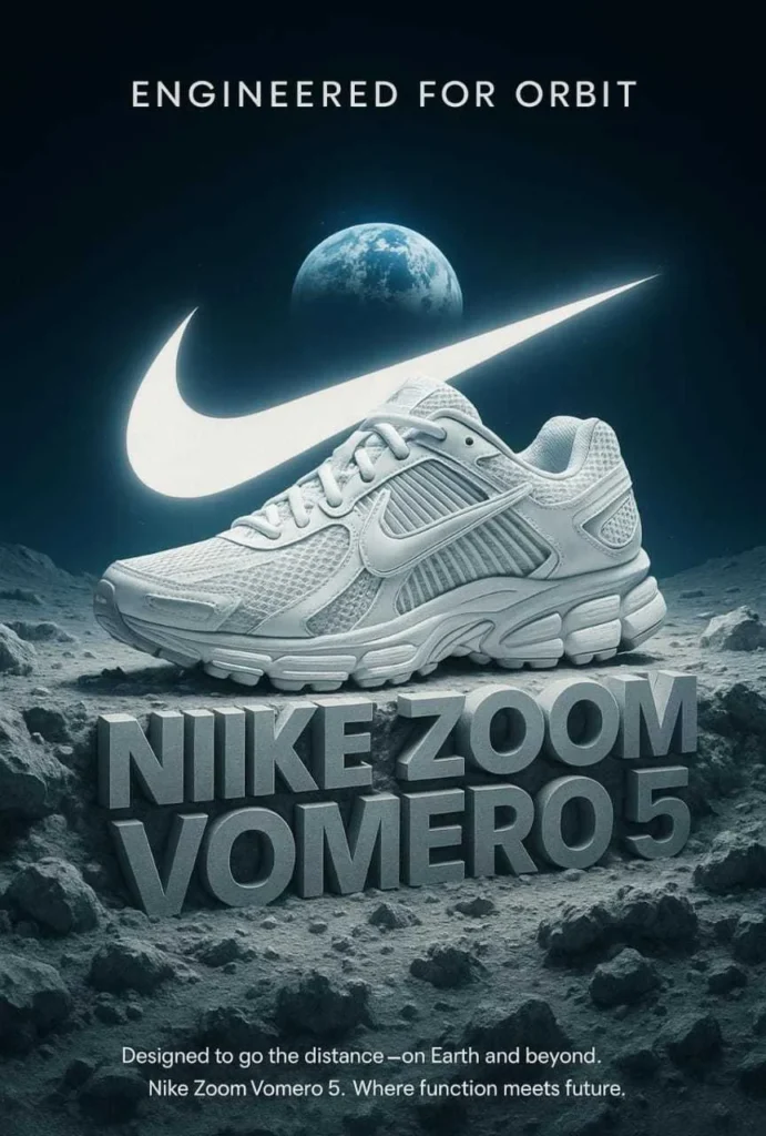 A futuristic, hyper-detailed concept artwork that reimagines performance running through the lens of cosmic exploration. Centered on the rugged, luminous surface of a stylized moonscape is the Nike Zoom Vomero 5 in White, a sneaker engineered for high-performance comfort, now portrayed as a tool built for interstellar endurance. The Vomero’s layered mesh and synthetic leather […]