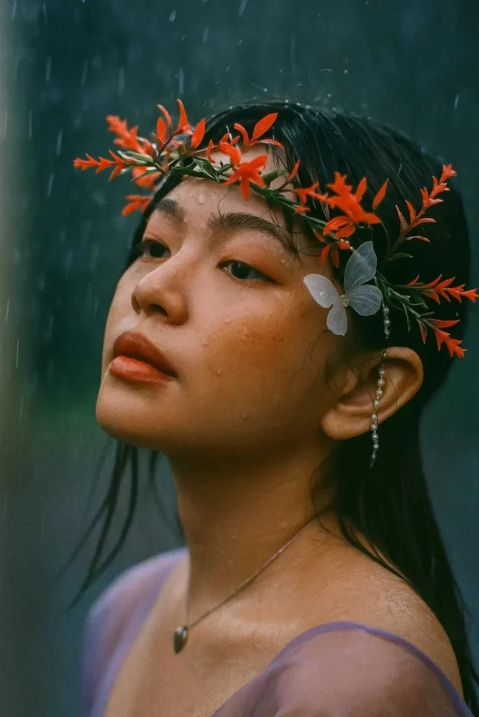 Create a sharp high definition image+ create a 3/4 profile close-up with a strong contrast 35mm film portrait of water up to 3,089 the shoulders, raining wet soft facial expression, blurred background lighting, small necklace with a heart engraved on the 1,111 pendant, head tilted back slightly. Make it look like me