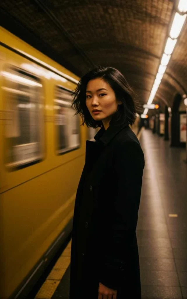 A hyperrealistic cinematic photograph capturing a fleeting, intimate moment on a dimly lit underground subway platform. The central subject is a stunning young Asian woman with windswept short black hair and a confident, direct gaze at the camera. She stands perfectly still, dressed in an elegant long black coat, a serene figure amidst the chaos. […]