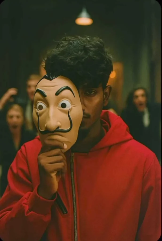half of my face giving Badass Looks or action, Wearing A red outfit from money heist series, People behind me running and scared, background with moody lightning 35mm film look Shallow depth of field, sharp focus on me and show the people a Little bit. Ratio potrait 4:3