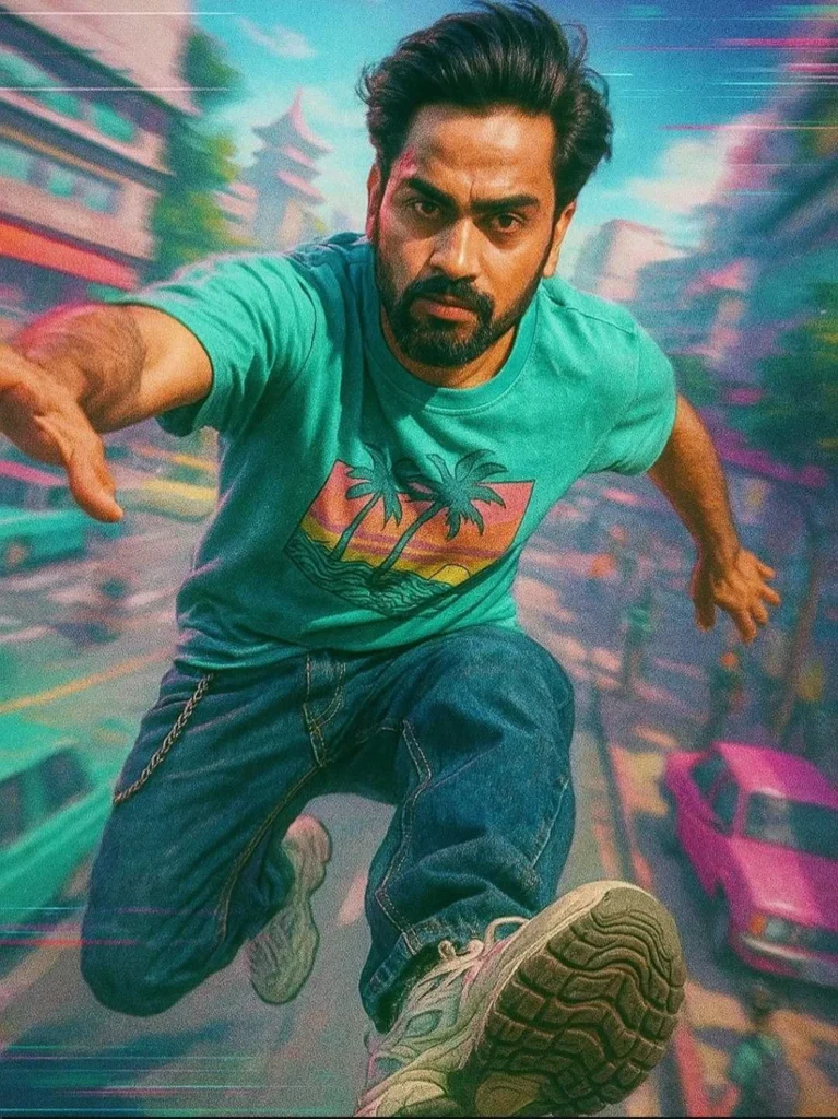 A cinematic portrait of a young South Asian man sitting confidently in a dramatic golden light. He wears retro-style round sunglasses, a wavy-patterned dark brown shirt with teal and beige tones, a gold chain around his neck, and a modern black watch on his wrist. His pose is stylish and bold, with one fist gently […]